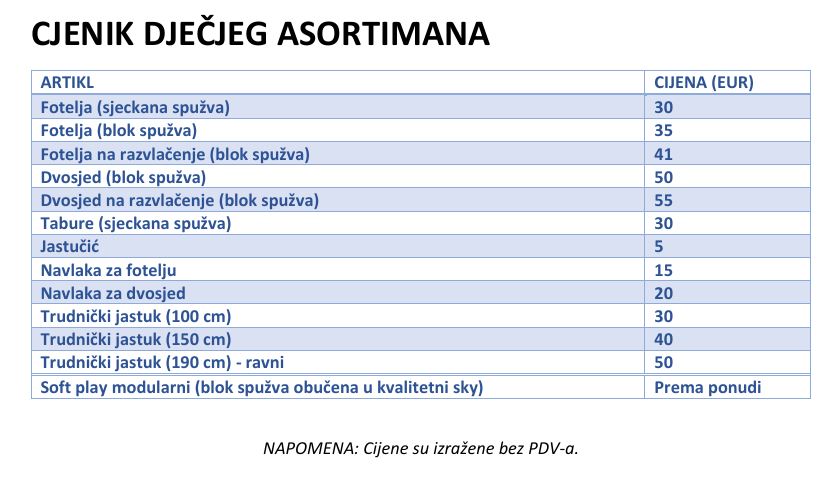 Cijena po komadu je 30 EUR + PDV za fotelje od sjeckane spužve. U ponudi imamo i fotelje od blok spužve po cijeni od 35 EUR + PDV te foteljice na razvlačenje po cijeni od 41 EUR + PDV.